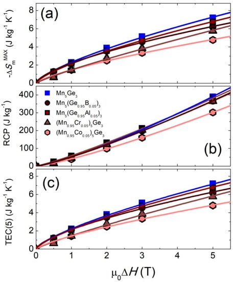 The dependencies of |∆Sm|MAX, RCP, and TEC(5) on the magnetic field change μ0∆H are plotted in Figure 7. From these graphs, one can read the value of the magnetocaloric parameters for any value of μ0∆H. For all parameters, we observed the power-type dependence ~μ0∆Hn. From the fitting of the |∆Sm|MAX and RCP data, the values of the critical exponents could be determined with the following relations: |∆Sm|MAX(μ0∆H) ~μ0∆H(1+(1/δ)(1−1/β)) and RCP(μ0∆H) ~μ0∆H(1+1/δ) []. At first, from the relation RCP(μ0∆H), we determined the value of δ = 1/(n − 1). Then, using the obtained value of δ and the parameter of the fit determined from the relation |∆Sm|MAX(μ0∆H) ~μ0∆Hn, the value of β was calculated according to the formula β = 1/(1 − δ(n − 1)). The obtained exponents β, δ, and n (for |∆Sm|MAX(μ0∆H)) and their expected values based on the relevant theoretical models are collected in Table 4. For Mn5(Ge0.95B0.05)3, Mn5(Ge0.95Al0.05)3, and (Mn0.95Co0.05)5Ge3, the obtained values of n and δ were closest to the 3D Heisenberg model, while for the Mn5Ge3 and (Mn0.95Cr0.05)5Ge3 alloys, they were closest to the mean-field model []. For TEC(5), the values of the critical exponent were very similar to those obtained for |∆Sm|MAX and equal to 0.72(2), 0.67(2), 0.72(2), 0.75(2), and 0.86(3) for Mn5Ge3, Mn5Ge2.85B0.15, Mn5Ge2.85Al0.15, Mn4.75Cr0.25Ge3, and Mn4.75Co0.25Ge3, respectively.
