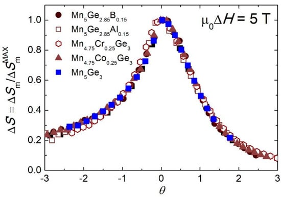 where Tr1 and Tr2 are the temperatures at which ∆Sm = ∆SmMAX/2 []. Figure 8 shows the θ dependence of ΔS’ for a magnetic field change of 5 T. The peaks of the curves collapsed onto the same universal curve, which is associated with the FM ordering transition of the second order and reveals a universal behavior of the (Mn1−xMex)5(Ge1−yOey)3 alloys. Similar results have been obtained in other studies [,].