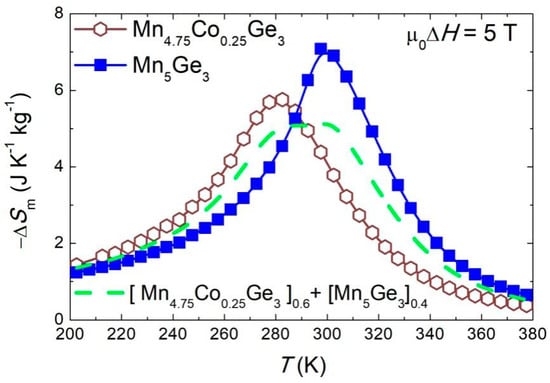 For some composites, an enhancement of the magnetocaloric properties was observed []. Therefore, we calculated the magnetic entropy change for an exemplary composite according to the equation: ∆Smcomp(T) = (1 − z)∆SmI(T) + z∆SmII(T), where ∆SmI(T) and ∆SmII(T) represent the experimental data for the composite components. In Figure 10, the calculated result (for selected z = 0.4 value) is compared with the experimental data for the Mn5Ge3 and (Mn0.95Co0.05)5Ge3 samples. Although the maximum value of ∆Sm was reduced to ~5 J kg−1 K−1, the composite sample showed a broad table-like magnetocaloric effect in a wide temperature range. Therefore, the RCP value was enhanced in this case up to 405(9) J kg−1, and the magnetocaloric properties were improved.