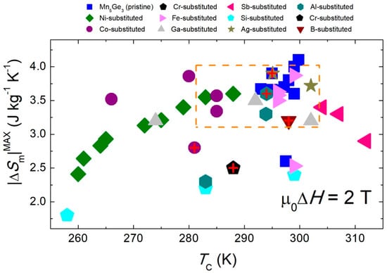 Maximum values of magnetic entropy change |∆Sm|MAX for different samples of Mn5Ge3 and Mn5Ge3-based alloys for a magnetic field change of 2 T taken from the literature (see Table 4). In the graph, the data for Mn5Ge3-based alloys are grouped according to the type of the substituted chemical element. The values obtained for the samples of the present work are marked with red crosses. The symbols within the rectangle correspond to the samples with an almost constant |∆Sm|MAX value in a wide temperature range.