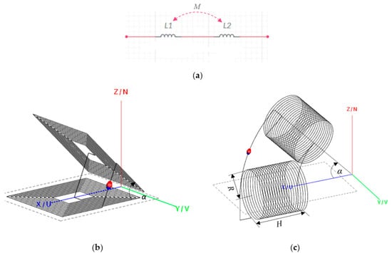 where M is the mutual inductance between the coils, and adding or subtracting depends on whether the coils are coupled in the same or opposite direction. The two coils are placed at two sides of the elbow. Then, as the angle between the inductors changes from αmin to αmax, the mutual inductance M between the coils changes, leading to a change in the total inductance of the two coils. The two coil shapes considered here to implement this idea were rectangular planar and helix coils, as shown in Figure 4b,c, respectively. We adjusted the size of the coils to the arm.