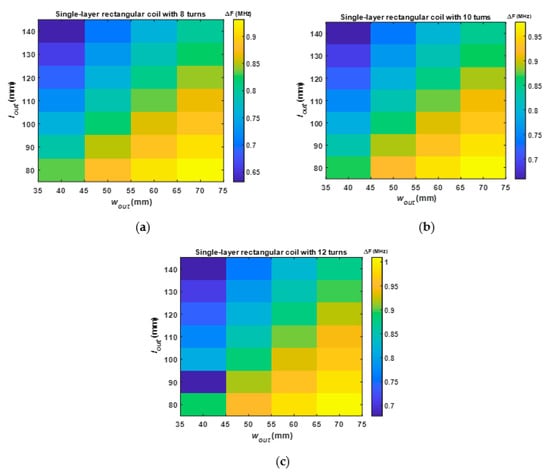 Figure 5 shows the results of computed for the first coil configuration (folding coil in Figure 3) when varying lout and wout. The bar on the side shows the value of frequency change in MHz. From αmax (where the coil was in a straight position) to αmin (where the coil was folded), the magnetic fields created by both half coils tended to cancel each other out, resulting in a smaller value of the total inductance. As it folded, the total inductance changed and was translated into resonant frequency change for the tank circuit. Additionally, as predicted, for a larger number of turns while keeping the ratios lout/lin and wout/win fixed, we obtained higher inductance values. Each graph shows that larger widths and a smaller lengths led to higher frequency changes. The folding axis of the single rectangular coil (as shown in Figure 3) was along the width dimension, which ˝cut˝ the coil into two equal halves with lengths of lout/2. Consequently, all turns of the rectangular coil were folded on their mid-point along the length dimension around the folding axis (they did not deform along the width dimension). It was demonstrated that the larger the width, the higher the inductance change (frequency change) over the angle. In other words, the width dimension was found to have a larger impact on the inductance change. As the coil folded, the elements along the width dimension grew closer. As a result, the mutual inductance increased. If the width became larger, then a stronger magnetic flux was generated by each element, resulting in a higher mutual inductance. Additionally, the shorter the length for the coil was, the closer the elements along the width could become when the coil folded. It is worth noting that similar observations were reported in []. The optimal parameters for this model were found to be a length (lout) of 80 mm, a width (wout) of 70 mm, and 12 turns.