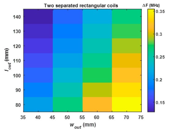 The second model consists of two rectangular coils, located on two sides of the elbow, one on the arm and the other one on the forearm. The coils were connected in series (as shown in Figure 4b) with an edge-to-edge distance of 95 mm to prevent direct contact between them when the bending angle reached αmin = 46°. As shown in Equation (3), the total inductance depended on the mutual inductance between the coils, and that, in turn, depended on the elbow joint’s angle. The closer they became, the higher the mutual inductance and its effect on the total inductance. As demonstrated in Figure 5, for one folding rectangular coil, the model with 12 turns provided a higher frequency change, as calculated from the inductance at αmin and αmax. Consequently, in order to have a higher inductance and a stronger magnetic field produced by the first coil passing through the second coil (to have higher mutual inductance), we simulated the second model in Figure 4b with 12 turns. Figure 6 shows the results of computed for the second coil configuration (Figure 4b) when varying the length and width of the coils. It was observed that the highest frequency change was for the length of 80 mm and width of 70 mm. With fixed ratios of lout/lin and wout/win, increasing the length and width resulted in the gap between turns becoming larger every 10 mm, which also affected the self-inductance and mutual inductance. The minimum of length and width led to the smallest gap, so the coils produced stronger magnetic fields that led to larger mutual inductance values and thus when the angle changed from αmin to αmax.