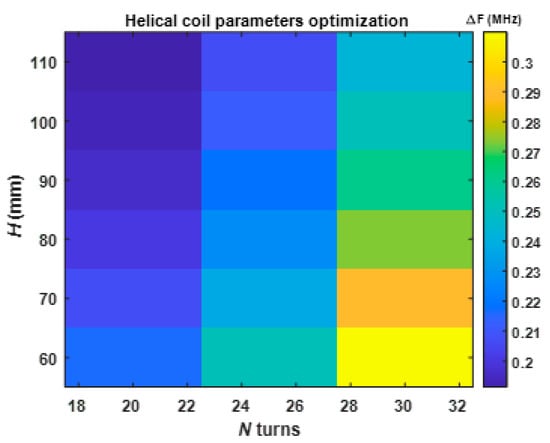 The helical coil model is another configuration that we studied. Two helical coils sewed around the arm were connected in series, as shown in Figure 4c. The radius R of the helix was set to 40 mm based on an average arm radius. The design parameters in this case were H (the height of the helix that changed from 60 to 110 every 10 mm) and N (the number of turns that changed from 20 to 30 every 5 turns). Figure 7 shows the values of computed for the third coil configuration (Figure 4c) when varying H and N. The graph shows that the highest frequency change was achieved at a height of 60 mm and N = 30 turns due to the same reason described in the previous case (for Figure 6). In other words, for the same number of turns, as the length became smaller, the magnetic flux created by the first coil passing through the second one became stronger, leading to larger mutual inductance and thus larger .