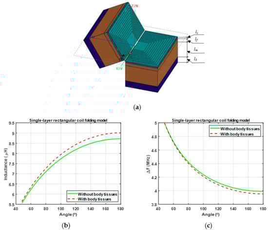 Single folding rectangular coil model of Figure 3: (a) with the arm tissues, (b) comparing the variation of inductance of the coil versus the joint angle with and without the arm tissues, and (c) comparing the variation of versus the joint angle for the models with and without the arm tissues.