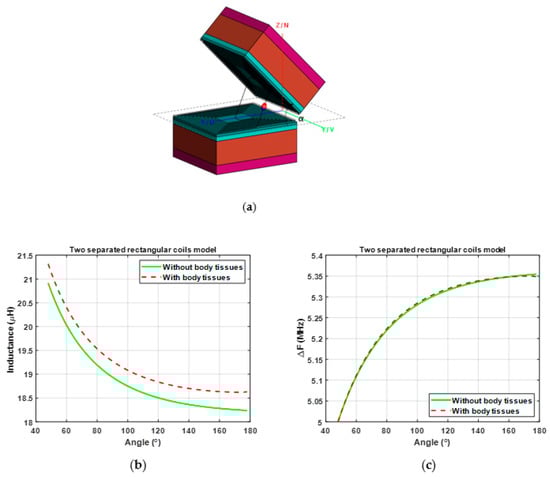 Model of two separate rectangular coils shown in Figure 4b: (a) with the arm tissues, (b) comparing the variation of the total inductance of the series coils versus the joint angle with and without the arm tissues, and (c) comparing the variation of versus the joint angle for the models with and without the arm tissues.