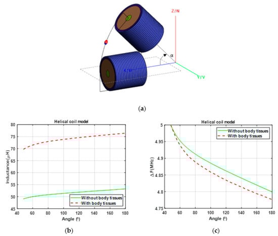The helical coil model of Figure 4c: (a) with the arm tissues, (b) comparing the variation of total inductance of the series coils versus the joint angle with and without the arm tissues, and (c) comparing the variation of versus the joint angle for the models with and without the arm tissues.