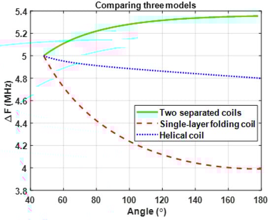 As stated above in the explanation of the single-layer folding model, as the angle became larger, the inductance increased due to the symmetric magnetic fluxes on two sides when the coil folded in the middle. The increase in inductance, in turn, led to the decrease in the resonant frequency (as shown in Figure 11). On the contrary, for the second configuration (two separated coils located on opposite sides of the elbow joint), the total inductance depended on the mutual inductance. In this case, we could control whether the mutual inductance was added or subtracted from the self-inductances of the coils to obtain the total inductance of the two coils in series. This was performed by determining the winding direction of the coils when they were connected. For the given model, coils were connected in such a way that their windings were in the same direction. So, the mutual inductance was added to the self-inductances of the coils to comprise the total inductance. Thus, as the angle became larger, the mutual inductance decreased, leading to a decrease in the total inductance. Figure 9b shows the relationship of inductance with the angle for this scenario. Following the above discussion, Figure 11 shows that as the angle grew larger, the inductance decreased and the resonant frequency increased. Lastly, Figure 10b shows that for the helical coil model, as the angle grew larger, the total inductance increased due to the mutual inductance between the two helical coils. The principle was the same as for the model of two separated coils, but in this model, the coils were connected in opposite directions. This led to the subtraction of the mutual inductance from the self-inductances of the coils when calculating the total inductance. The increase in the total inductance, in turn, led to a decrease in the resonant frequency.