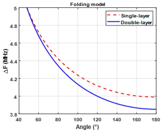 To summarize the analysis of three sensing configurations, Figure 11 shows the variation of the frequency change over the joint angle for the three configurations. Opposite behavior was observed for the models of the single-layer folding coil and two separated coils. Since the frequency response was inversely proportional to the inductance, when the inductance over the angle decreased, the resonant frequency increased and vice versa.