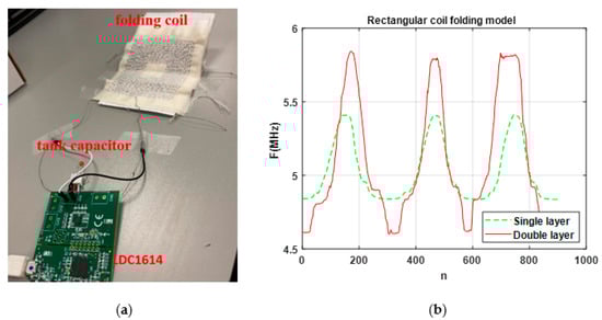 From Figure 11, the folding coil showed the best performance of the three studied sensing configurations. The parameters of the sewed single-layer folding coil were a length of 80 mm and a width of 70 mm. In addition, the same dimensions were used to sew a two-layer coil, with the gap between the two layers set as thin as possible to make this sensing model more comfortable to wear.