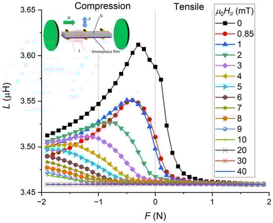 Figure 1 presents the result of the inductance measurement of the coil, for the case where the applied field was in the sample axis. For the case where there was no applied field, H// = 0, the compressive stress affected the inductance differently when compared to the tensile one. The curve was not symmetric with respect to the force. The curve was maximum at a critical force Fc, and the decrease was smooth for the force on the compression side and sharp on the tensile side of the curve. At a large applied force, F > 1 N, the inductance became constant at a value of L ~ 3.46 µH. As the magnetic field H//was increased, the initial inductance measured at zero force was decreasing to the same inductance value of L ~ 3.46 µH. In fact, the longitudinal field was (i) shifting the inductance versus force curve toward compressive force and (ii) reducing the inductance amplitude. Eventually, at larger fields, the inductances versus force curves were constant with values of L ~ 3.46 µH in the force measurement range.
