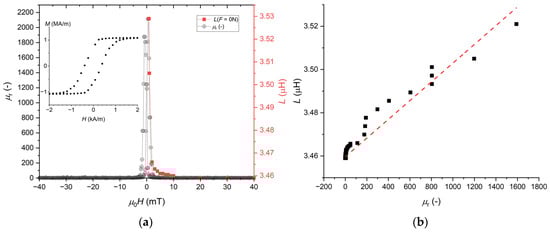 (a) Permeability obtained from the VSM (black circle) and coil inductance (red square) measured on a sample without a magnetic field; the inset shows the magnetic loop M versus H; (b) Approximation of the relationship between the measured inductance to the permeability.