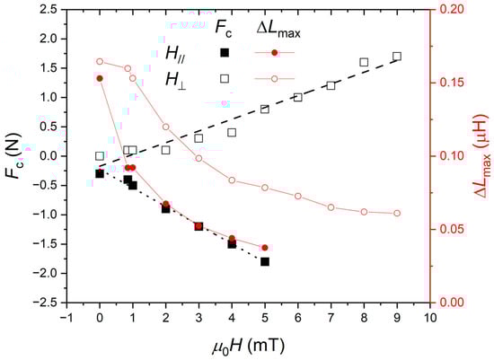 Figure 4 shows the critical force Fc and the peak amplitude ΔLmax for all the tested configurations. The magnetic field direction was clearly changing the position of the inductance peak. Longitudinal field (H//) was reducing the critical force (dFc/dH < 0) and the orthogonal field (HꞱ) was increasing the critical force (dFc/dH > 0). In both cases, a linear tendency was observed. The peak amplitudes ΔLmax were reduced by the magnetic field: with H//, the decrease was faster than with HꞱ. The tendency of ΔLmax with applied fields was nonlinear.
