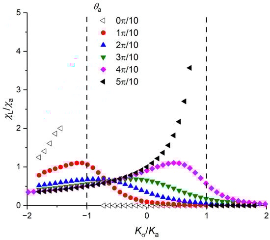 Figure 6 is presenting the curves χL/χa versus the anisotropy ratio Kσ/Ka: defined as the ratio between the magnetoelastic anisotropy (Equation (5)) and magnetic anisotropy constant, with an angle θa between these two anisotropy directions. The magnetostriction constant was supposed to be λs = 30 ppm. Firstly, it can be observed that at angle θa = π/2, a peak appeared in the tensile stress part (σ > 0) at the exact value Kσ = +Ka. This situation is similar to the magnetic field H = Ha applied perpendicularly to the anisotropy axis, as discussed previously, where the energy is independent of the magnetization angle (Appendix A and Appendix B), yielding to largest susceptibility. At angle θa = 0, a sharp peak appeared in the compressive stress part (σ < 0) at the exact value Kσ = −Ka because the total energy angular dependence would disappear.
