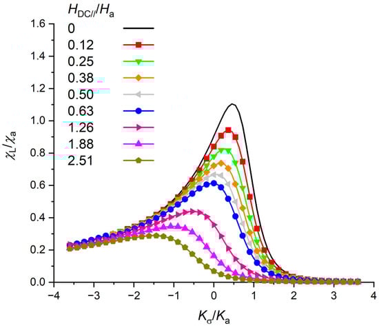 Relative susceptibility components (χL/χa) versus anisotropy ratio Kσ/Ka with λs = 30 ppm for different longitudinal field.
