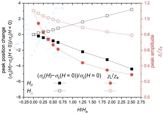 Peak parameters: critical stress σc and maximal susceptibility change versus the applied magnetic field.