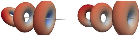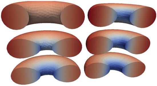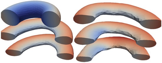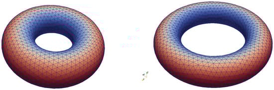 In Figure 1 (left) can be seen the initial volume torus mesh used for all the major calculations presented in the current work. It was generated using the distmesh algorithm [] and has 4407 nodes and 24,699 tetrahedral elements, with major and minor radii of and , respectively, giving an overall volume of about 0.1.