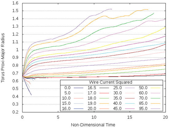 Plots of the proxi-major torus radii over non-dimensional time t from initial state, , for a selection of different wire currents, .
