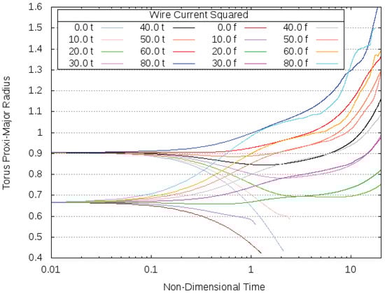 Plots of the proxi-major torus radii over non-dimensional time t from two different initial states “f” and “t”, with respectively and (scaled out from 0.84 to give same torus volume—see text) for a selection of different wire currents, .