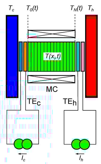 The possibility exists of combining the strengths of the TE and MC methods to produce a hybrid system. Tomc et al. [] and Egolf et al. [] proposed a combination of TE and MC methods to achieve a substantial improvement compared to use of the MC method alone. This occurs because the TE method has low efficiency for a high temperature span , but increases strongly for low, or even negative, , which can be supplied by the MC subsystem. As outlined in Figure 1, a TE-MC-TE sandwich is placed between a cold heat source at temperature and a hot heat sink at . An alternating magnetic field is applied to the MCM. When the magnetic field is on, the MCM is at its highest temperature, close to . Then, the right-side TE cell is activated and pumps heat from the MCM to the hot sink. When the magnetic field is off, the MCM is cold, eventually being near or colder than . The left side TE cell is then activated, transferring heat from the cold source to the MCM. De Vries and van der Meer [] performed a simulation of a similar system, concluding that the cooling capacity was similar to that of Peltier cells alone, but their system used a fluid as a regenerator. Moreover, it is likely that the working parameters were not optimized. Huang et al. [], very recently, reported a simulation for a complete MC system using Peltier cells as thermal diodes. This study involved simulation of Gd as the MC material and obtained moderate efficiencies. The key problem, that of using a material with second-order transition, was diluted among many other influences on heat losses and leaks. We presented some preliminary results of the simulation of a single sandwich in the conference THERMAG VIII [], concluding that the TE-MC hybrid system was an interesting procedure, but that there were many variables to be optimized. Monfared [] simulated a battery of sandwiches which were designed to reach higher temperature spans.