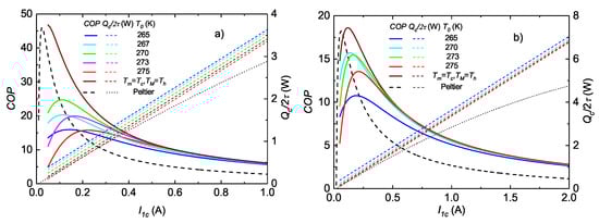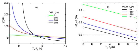 Figure 5a shows of the pure TE system with an increasing temperature difference for several current supplies, , to both TE cells. For very weak currents, reaches very high values for small or negative (for negative , the Carnot is also negative since the system transfers heat from (higher) to (lower) and produces work). For higher currents the system can pump heat across higher , but with low efficiency. Figure 5b shows the cooling power , which decreases with and increases with the current, for low currents. In particular, it is clear that, for A, the Peltier cells can transfer heat with high efficiency for K and are able to stop heat leakage for K. On the other hand, it is also clear that a Peltier system supplied with high current, A, does not benefit greatly from a small or negative . In our opinion, this is the cause of the small effect of the MCM in [], where currents of 0.01 A might be too strong given the size of the Peltier cells used there.