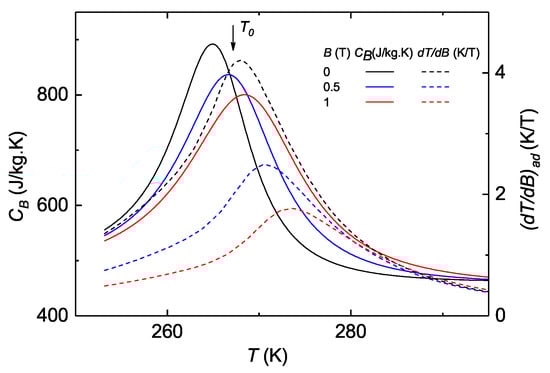 Heat capacity and of a La(Fe,Mn,Si)H alloy for B = 0, 0.5, and 1 T, and K. The arrow indicates the characteristic temperature . For other values of , all data are displaced correspondingly. These data were obtained from measurements in real alloys following the procedure described in [].
