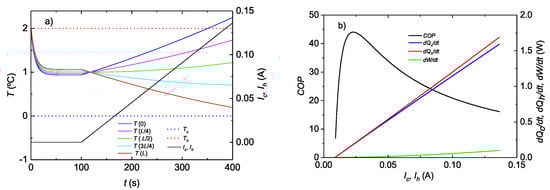 Figure 4a shows the temperature of the MCM at five points , with s and increasing the current supply through the TE cells, for K. The conductivity of the MCM was set to W/m·K (ten times lower than in other simulations). At s, A, this weak current is enough to avoid heat leakage from the hot side to the cold side, since the T gradient is nearly zero in the MCM. For higher currents, the Peltier cells transfer heat from the cold side to the hot side. Figure 4b shows that increases with , but reaches a maximum outside the figure. The maximum , which is of (Carnot), occurs for A, a very high value, but lower than that obtained for the same without the MCM (see Figure 2a). This is due to the relatively low thermal conductivity of the MCM. The heat flow by conduction imposes a large T gradient, making the thermal jump greater than on each TE cell, which reduces its efficiency. Therefore, when the MCM does not play its role, it is a handicap for the system performance. A high conductivity of the MCM becomes critical. It can be increased by alternating copper sheets ((Cu) W/m·K, forty times higher than that of the La(Fe,Si) alloys) parallel to the heat flow. For higher currents, decreases rapidly as is usual in a TE refrigerator.