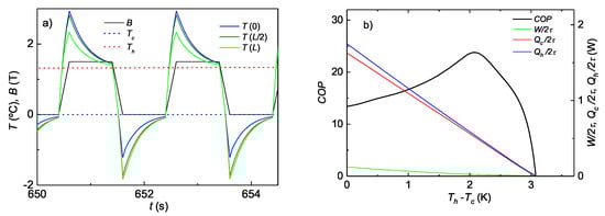 Pure magnetocaloric cooling using thermal diodes can be simulated with the same program, fixing , but imposing different conductances in opposite directions for the TE cells. Let be the thermal conductance to the right side and to the left side. We assume mW/K to be equal to the real conductance of the Peltier cell 1ML07-050-15AN25 and . This high rectification ability is difficult to achieve with real thermal diodes [], but serves to evaluate the pure MC refrigeration. Figure 6a shows the evolution of the temperatures at three points of the MCM described in Section 4.2, while the magnetic field varies as a quasi-square wave between 0 and 1.5 T, with frequency Hz. The hot-side temperature is forced to increase linearly and slowly with time (this variation cannot be noticed in the time range plotted in Figure 6a), at mK/s, from = 400 s to the end of calculation, = 1219 s. The gradient of is high during, and just after the end of, the field variation, but the MCM tends to thermal equilibrium with either the cold source or the hot sink during the time span of constant B. The frequency should be adjusted for the conductivity, dimensions, and properties of the material. The relaxation time of the MCM is s. This value should not be much lower than (more precisely the time with constant field, which in the simulation of Figure 6a is s). If , the system does not present any advantage and if , the MCM reaches the thermal equilibrium with the hot or the cold source too early in each semi-period and spends a long time afterwards transferring no heat. Figure 6b shows and the cooling power of the system with thermal diodes. The maximum occurs for a given value ( K in this example) which is determined by the material, the dimensions, and the magnetic field. All these parameters are difficult to change, assuming the magnetic field is produced by a permanent magnet. Therefore, the dimensions should be well-designed for a given application. The system with thermal diodes with La(Fe,Mn,Si)H cannot pump heat for K in a single stage with T, but the temperature jump can be increased using several sandwiches in series, with alternate fields on consecutive elements.