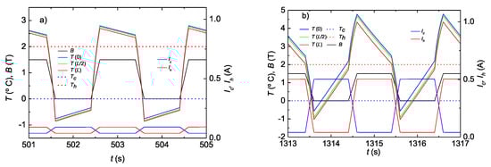 Figure 7 shows a few periods of the evolution of the temperatures at five points along the length of the MCM for a simulation where the currents at the TE cells, , , and the magnetic field are varying as quasi-square waves. After reaching the steady regime, at = 400 s, the current amplitudes increase very slowly, starting at 0.04 A (estimated to prevent heat leakage) up to 1 A, always with constant magnetic field amplitude T and fixed temperatures of the cold source and the hot sink, K, K. The quasi-steady regime can always be assumed. The characteristic temperature (transition at zero field) of the MCM is K. Assuming a similar notation to that of Table 1 for the temperatures and currents (, , now time-dependent, are the average temperatures of the MCM when the field is off and on, respectively). As shown in Figure 7a, left panel (where the currents are low: A), when the field amplitude is increasing from 0 to , the temperatures also increase, reaching a maximum, , at the time of maximum field. Then, the hot TE cell is activated, transferring heat to the hot sink. In contrast to an ideal system in phase coexistence, depends on time (it also has a negative gradient allowing the heat to diffuse towards the right side edge). decreases slowly and quasi-linearly (since the transferred heat power is approximately proportional to the current, constant in this stage), down to , at the end of the maximum field stage. Then, the hot TE cell is deactivated (i.e., with reduced to A), and the field is rapidly decreased to zero in one tenth of the period. The temperatures drop down to a value . At this point the cold cell is activated and increases slowly up to , while some heat is transferred from the cold source to the MCM. Finally, the cold TE is deactivated and the magnetic field is increased again, repeating the process quasi-periodically. The current amplitudes are very slowly increasing. This increase can barely be noticed within a few periods, but the different currents are clearly distinguished between s (Figure 7a) and s (Figure 7b).