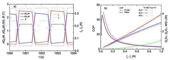 Figure 8a shows the instantaneous heat powers extracted from the cold source and released to the hot sink. It can be observed that, when the magnetic field is high, the hot TE cell transfers heat to the hot sink and the cold TE cell extracts a small heat power from the cold source. However, when the field is zero, the cold TE cell extracts heat from the cold source and the lowest current is just enough to avoid heat leakage. Figure 8b shows the COP, the cooling and heating average powers, and the average work power per cycle, along those for a pure Peltier cooling. In the last case, the powers are divided by two, taking into account that, in the combined method, each cell is activated for one half of the period. Choosing suitable parameters, the COP and the cooling power are higher for the hybrid system, although lower than for an ideal Carnot device with the MC subsystem. In particular, for low currents, the COP can show a relevant increase. For instance, for A, increases from 24 to 31. As a comparison, with these data, the pure MC cooling with ideal thermal diodes (Figure 6b) has a fixed cooling power 0.56 W and = 23.6, which can be compared with obtained with the hybrid system for the same cooling power and the same .