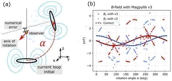 (a) Sketch of typical current loop positioning with the package Magpylib. (b) Demonstrating the relevance of the numerical instability, which becomes visible when a current loop rotates about an observer.