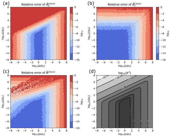 The origin of the observed instabilities is numerical cancellation when evaluating the functions and in (5). Both functions are made up of two summands that tend to and , respectively, for , which corresponds to regions close to the axis and far from the loop, as can be seen from Figure 3d.
