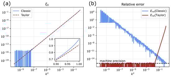 Relative errors of the two implementations are shown in Figure 4b. With decreasing k the straightforward implementation loses precision. Below the relative error exceeds 1 which is understood as a complete loss of precision. On the other hand, the accuracy of the Taylor series increases with decreasing k until the truncation error undercuts the machine precision. For small values of k, this Taylor series can be used as an excellent numerical reference.
