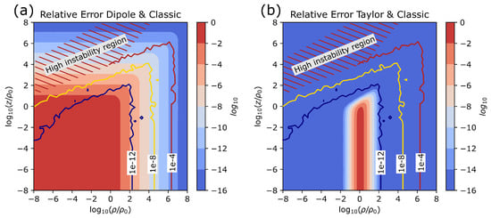 In Figure 8b, we show the maximal vectorwise relative computation errors of the different methods. Interestingly, convergence and divergence of most methods can be observed well as functions of . For the dipole approximation only positions with on the contour lines are included, because it does not converge close to the origin. The stable solution is not visible in this figure, because it is used as a reference. It has machine precision everywhere.