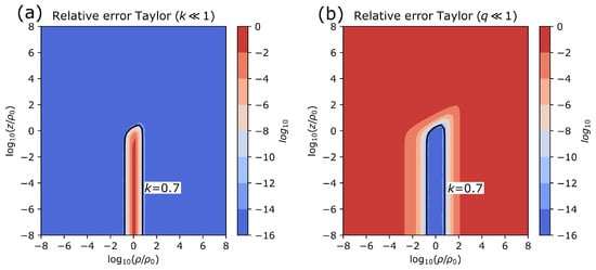 Here e denotes Euler’s number. It is shown in Figure 6 that it is possible to cover all of by overlapping a k-series and a q-series. Specifically, two such series that include terms up to order and with cutoff criterion globally undercut a componentwise relative error of . The respective contour is shown in Figure 6a,b.