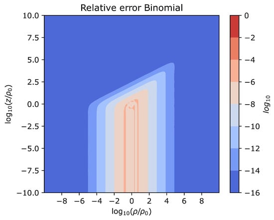 When implementing the above expressions, great care must be taken with the functions and , as they are numerically unstable for small values of W. For this purpose, special implementations, commonly termed and , can be used. The resulting accuracy is displayed in Figure 7, and confirms the claims made in [], that more than five significant digits are achieved everywhere with this approximation.