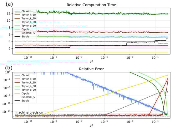 (a) Computation times of various methods with respect to the fastest one (dipole) as a function of . (b) The respective vectorwise relative errors.