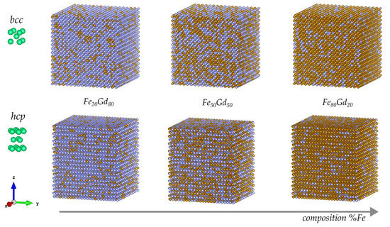 It is important to highlight at the beginning that system generation in Vampire allows for the simulation of alloy material by the random allocation of atoms of different elements in the chosen crystal structure. This allows for the possibility to approximate the effects of real amorphous alloy materials. Since the crystal structure is used as a basis for random alloy formation, a different coordination number in certain structures may influence the simulated magnetic behavior. Therefore, we performed a calculation using two different structures, bcc and hcp, as the counterparts of Fe and Gd bulk materials, respectively. The generation of the alloy system was done by the following procedure. The n × n × n cells of the defined crystal lattice (bcc and hcp) were generated with applied periodic boundary conditions in x, y and z dimensions to simulate the effect of bulk structure. Then, the formed crystal was populated with a random distribution of Fe and Gd atoms in the defined concentrations (according to the desired composition of FexGd100−x alloy). In such a way, the random allocation of TM and RE ions in the crystal was used to approximate the effects of an amorphous TM-RE alloy. The simulated structures used in the study are shown in Figure 1 for three exemplary alloy compositions. Let us note that such a theoretical model is confirmed to be successfully used for simulations of simple magnetically amorphous alloys and calculations of their magnetic properties, which are comparable with the experimental data [21].