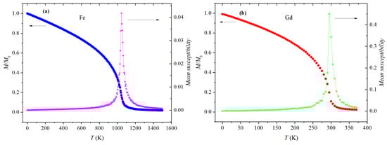 The calculated temperature-dependent normalized magnetization (M/Ms, hereafter called M(T)) curves, are shown in Figure 2. In order to determine the value of the critical temperature, different approximations can be used, such as Curie–Bloch or Kuz’min equations [37]. These relations allow for a good estimation of the Curie temperature for the elemental ferromagnets; however, very often, the magnetic transitions for the material can be smeared and the determination of Tc loses its criticality. Therefore, we used the maximum of the mean susceptibility curve as the method for critical temperature determination (Figure 2). Obtained values T c F e   = 1045(5) K and T c G d   = 295(5) K for the investigated materials are in good agreement with the experimental data for bulk iron and gadolinium ferromagnets. In such a way, the model used describes the M(T) behavior of bulk Fe and Gd structures well and can be applied for further analysis.
