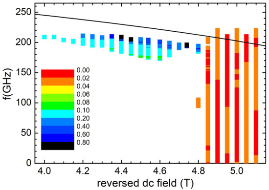 The points corresponding to conditions for which magnetization reversal occurs within 1 ns are denoted. These points fall below a straight line corresponding to the ferromagnetic resonance (FMR) frequencies given by the Kittel condition , where Hdc is the coercivity without MAS. The color code represents the time of the reversal. For this disk geometry, the demagnetization factor along the z direction is N = 0.7341. For a hard phase with anisotropy Kmc and saturation magnetization MS, the coherent rotation coercivity is given by the relation: