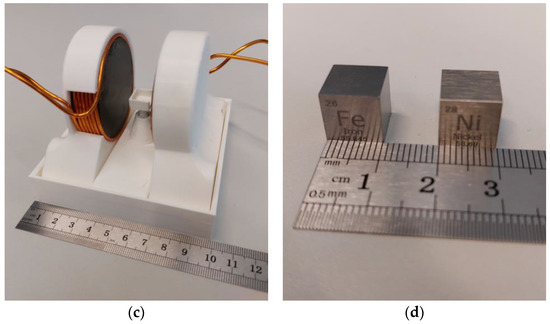 Used setup: experimental setup without (a) and with (b) test cubes; 3D-printed housing with coils and ferrites; (c) and nickel and iron cubes used as test objects (d).