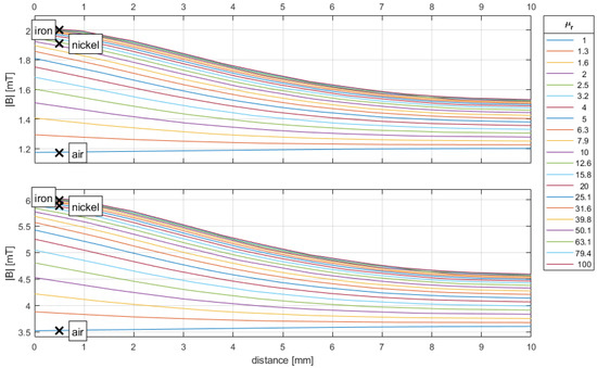 The value μr = 1 corresponds to an airgap between the coils without any object placed in between. In this case, no field amplification occurs, and the magnetic flux density B is at its lowest and is indicated by the bottom line. The measurement results are shown as crosses at the position of the hall element located at 0.5 mm. The measurement results for the experimental setup without any object and filled with air are in good agreement with the simulation results for both currents used in the experiment. The position x = 0 mm represents the surface of the cube, while x = 10 mm represents the surface of the ferrite core. When the permeability increases, more field lines are forced through the smaller surface of the cube, resulting in a higher magnetic flux density on the cube surface as compared to the ferrite core surface. In the absence of any foreign objects in the setup and filled with air, the field lines may expand in the middle, leading to a lower flux density.