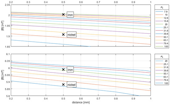 In Figure 5, it can be observed that the relative permeability μr of nickel lies between 10 and 12.6 for a current of i1 = 5 A and between 20 and 25.1 for a current of i2 = 15 A. On the other hand, the relative permeability of the iron cube is just under 79.4 for a current of i1 = 5 A and between 63.1 and 79.4 for a current of i2 = 15 A.