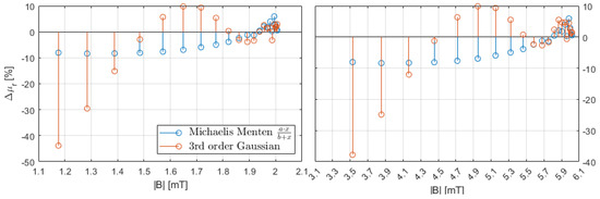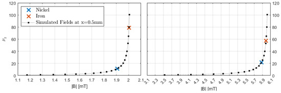To obtain a numeric value for the permeability of the cubes, the simulation results can be used to represent the relative permeability of the object as a function of the magnetic flux density at the measurement position, which is located 0.5 mm outside of the object. The appropriate function can be determined by curve fitting the individual simulation points. Various model functions were tested for this purpose, such as polynomial functions 8th order or gaussian functions third order. The Michaelis–Menten Equation (1), which is commonly used in biochemistry, provides the most accurate approximation, as can be seen in Figure 6.