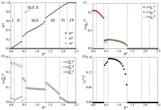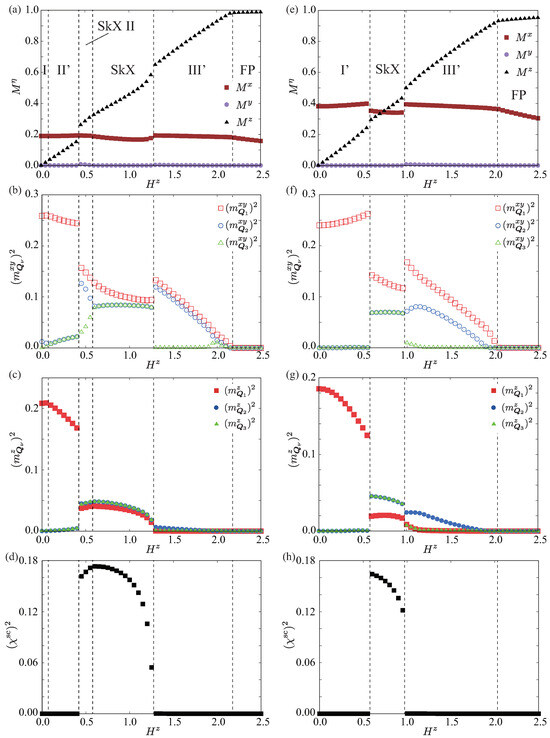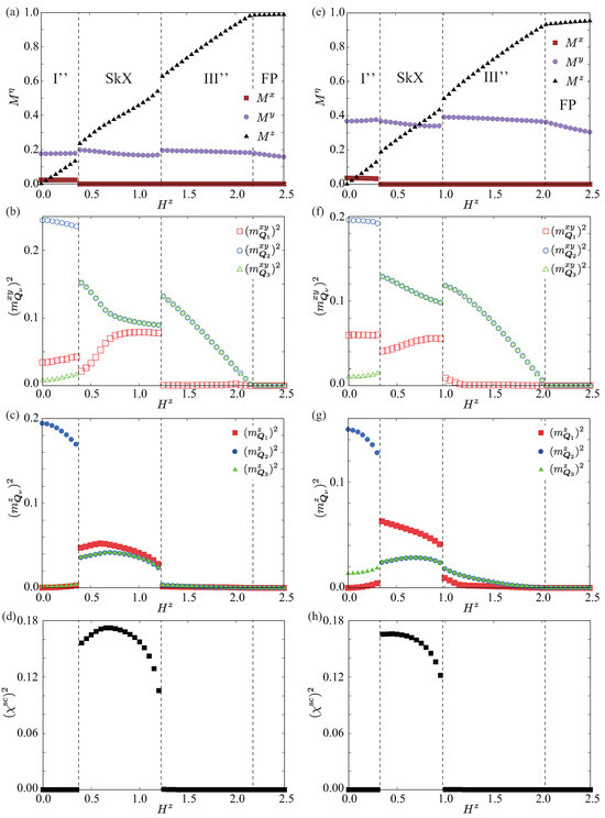 In the high-field region for at , the magnitudes of the triple-Q ordering wave vectors become nonzero with different intensities in both the and z components, as shown in Figure 6b,c. We denote this phase as Phase III’. Such a feature holds for larger , as shown in the case of in Figure 6f,g. This anisotropic triple-Q phase is replaced with the single-Q state stabilized in the low-field region by further increasing , as shown in Figure 4b–d. The net scalar chirality remains zero in the regions of Phase I’, Phase II’, and Phase III’, as shown in Figure 6d,h.