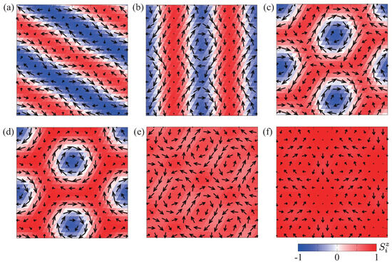 For these wave vectors, is given so as to satisfy the sixfold rotational symmetry as follows [101]: . This symmetric anisotropic form factor corresponds to bond-dependent interaction, such as the compass and Kitaev interactions [106,107,108,109,110], which become the origin of unconventional topological spin textures [111,112,113,114] and nonreciprocal magnon excitations [110]. Furthermore, this type of symmetric anisotropic exchange interaction on the triangular lattice induces the SkX even in the absence of multiple-spin interactions or easy-axis single-ion anisotropy [49,100]. We focus on the behavior of the SkX induced by against the magnetic field direction in Section 3 and compare the results among different mechanisms in Section 4.
