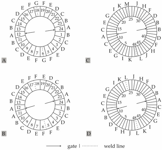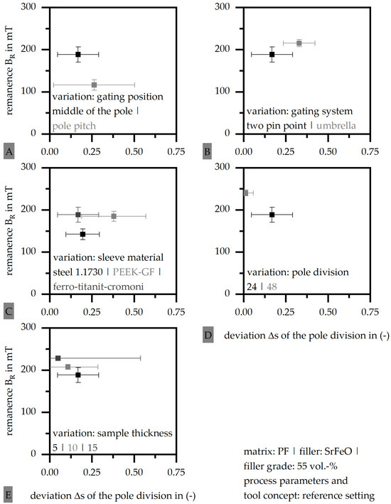 Figure 7 in terms of the variation of the gating position (A), the gating system (B), the sleeve material (C), the pole division (D), and the sample thickness (E). The results are shown exemplarily for the PF matrix material and a moderate filler grade of 55 vol.-%, while the process conditions and the tool concept are kept standard. Due to the change in the gating position from the middle of the pole to the pole pitch, the value of the remanence (B