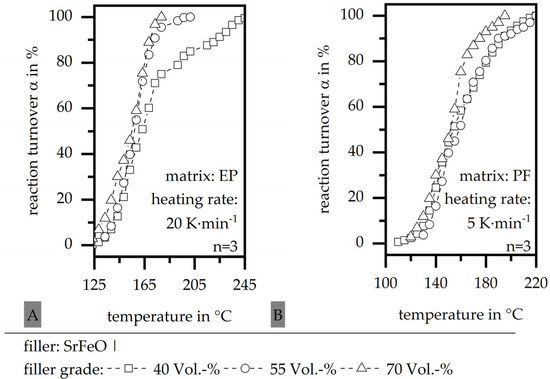 Figure 3B. The route shows a typical s-curve, with a high rate of change in the middle section. Further, there is a tendency for an increasing filler grade to shift the routes toward lower temperatures. This goes along with the reduction of the matrix amount in the material system, which reduces the material proportion, taking place at the chemical reaction. However, the effect is only small. More importantly, the route of the reaction turnover α is shifted to lower temperatures in terms of a PF matrix, with an offset of about 20 °C between the two material systems. This is mainly important with respect to the process parameters, as the curing of PF starts at lower temperatures, and therefore, the material is more affected by temperature as a trigger of the chemical process.