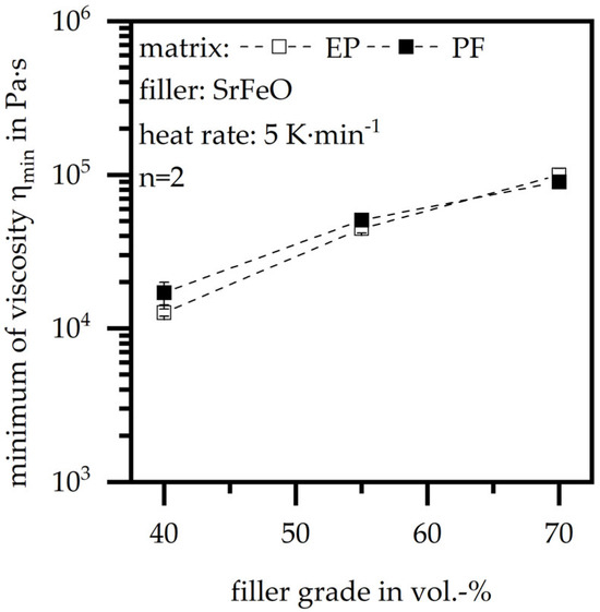 min when using an EP based material system, at least for lower filler grades. The filler grade itself has a higher impact on the minimum viscosity (η