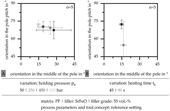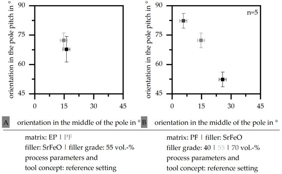Figure 8 shows the change of the orientation comparing EP and PF (A) and the filler grade between 40 and 70 vol.-% for a PF matrix (B). The process conditions and the tool concept are kept constant, and the orientation is investigated in the middle of the sample thickness. The orientation is slightly improved in terms of the PF matrix compared to the EP matrix in both the middle of the pole and the pole pitch, with lower standard deviations in terms of PF. In terms of the increasing filler grade, the orientation is highly improved with an increasing amount of fillers, which goes along with the change in the remanence (B
